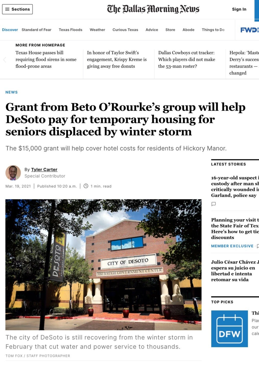 The next year, during the 2021 Texas power grid failure, our volunteers made more than a million phone calls to senior citizens across the state to connect them with warming centers, clean drinking water, food and transportation. We also raised more than $1.4 million and donated every penny of it to local programs throughout the affected parts of Texas to provide shelter, water and assistance to people and communities who bore the brunt of this man-made disaster.