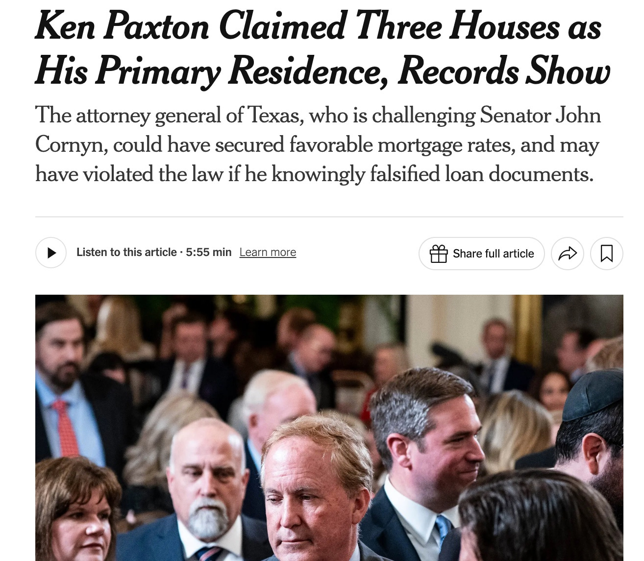 Now this summer, we’ve learned that Paxton claimed as his primary residence three separate houses, allowing him to illegally lock in low interest rates. These lower rates saved the Paxtons tens of thousands of dollars in loan payments. Paxton also received an improper homestead tax break on two of those homes. To be clear, it is both a federal and a state crime to make false statements on mortgage documents and it is illegal in Texas to take a homestead tax break on two separate properties.
