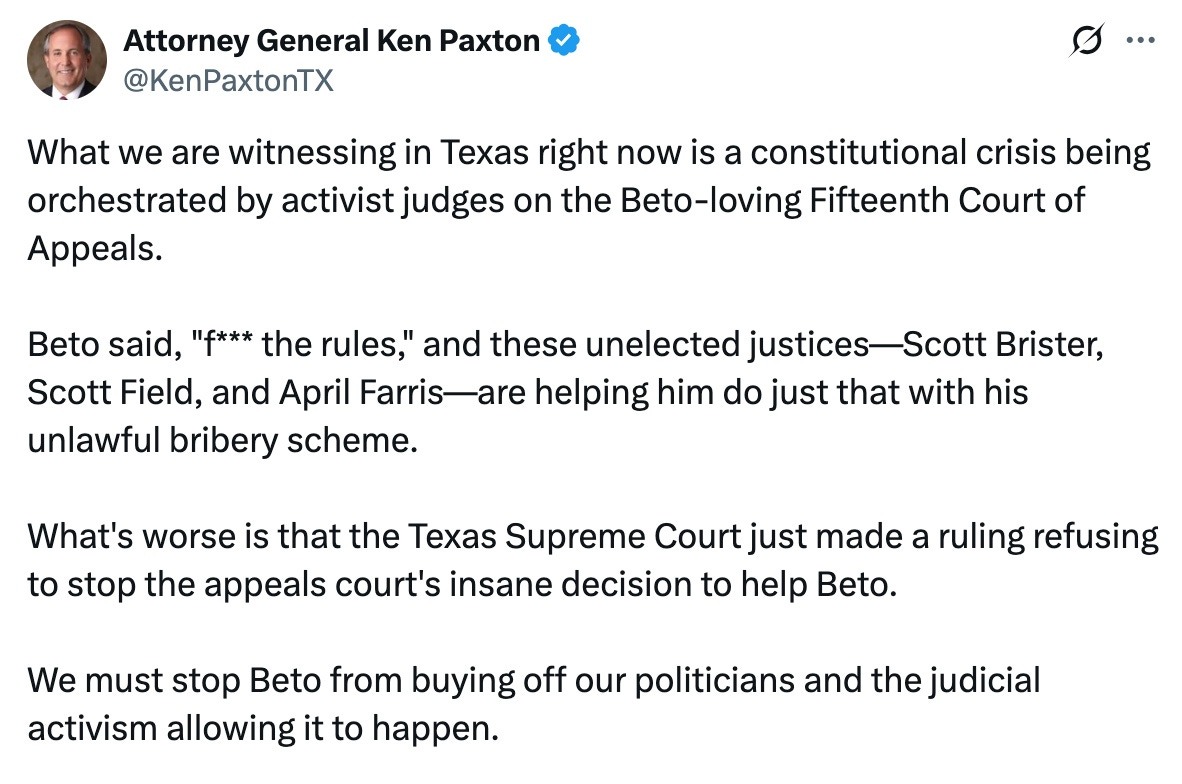 This might help explain why Ken Paxton would rather divert public attention to me and Powered by People through this aggressive, frivolous and untruthful litigation than address his own very real and successful efforts to break the law, weaponize the justice system and do the political bidding of his patron, Donald Trump.